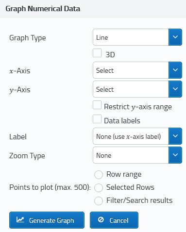 To view the graphing dialog, select Graph Numerical Data from the left menu (desktop mode) or via the hamburger menu (mobile mode) from the interactive table you wish to graph.